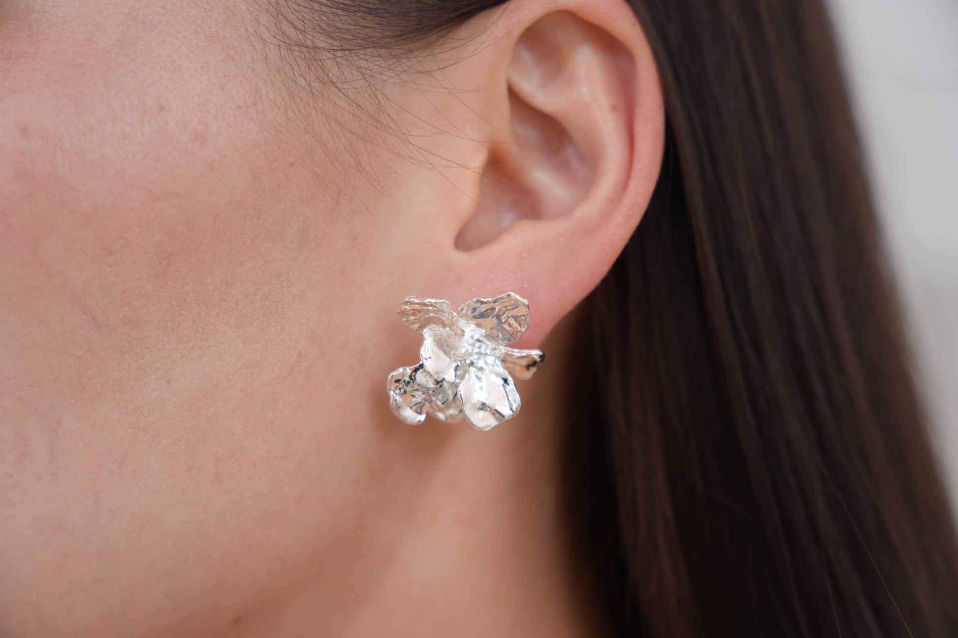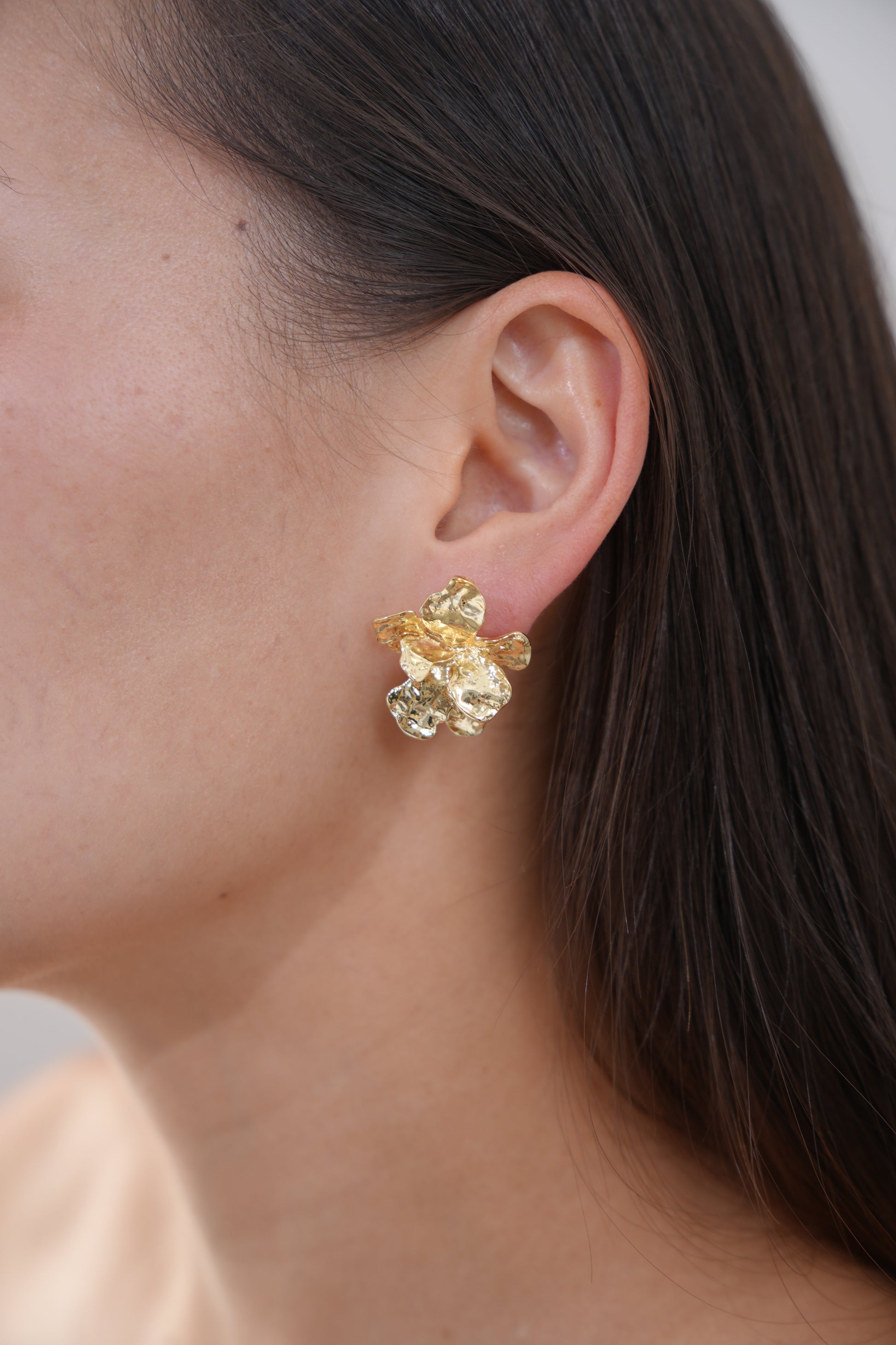These bold, petal-shaped studs are cast in a molten metal finish that catches light with every angle. Their abstract floral silhouette adds texture and energy to any outfit; available in gold and silver tones.
