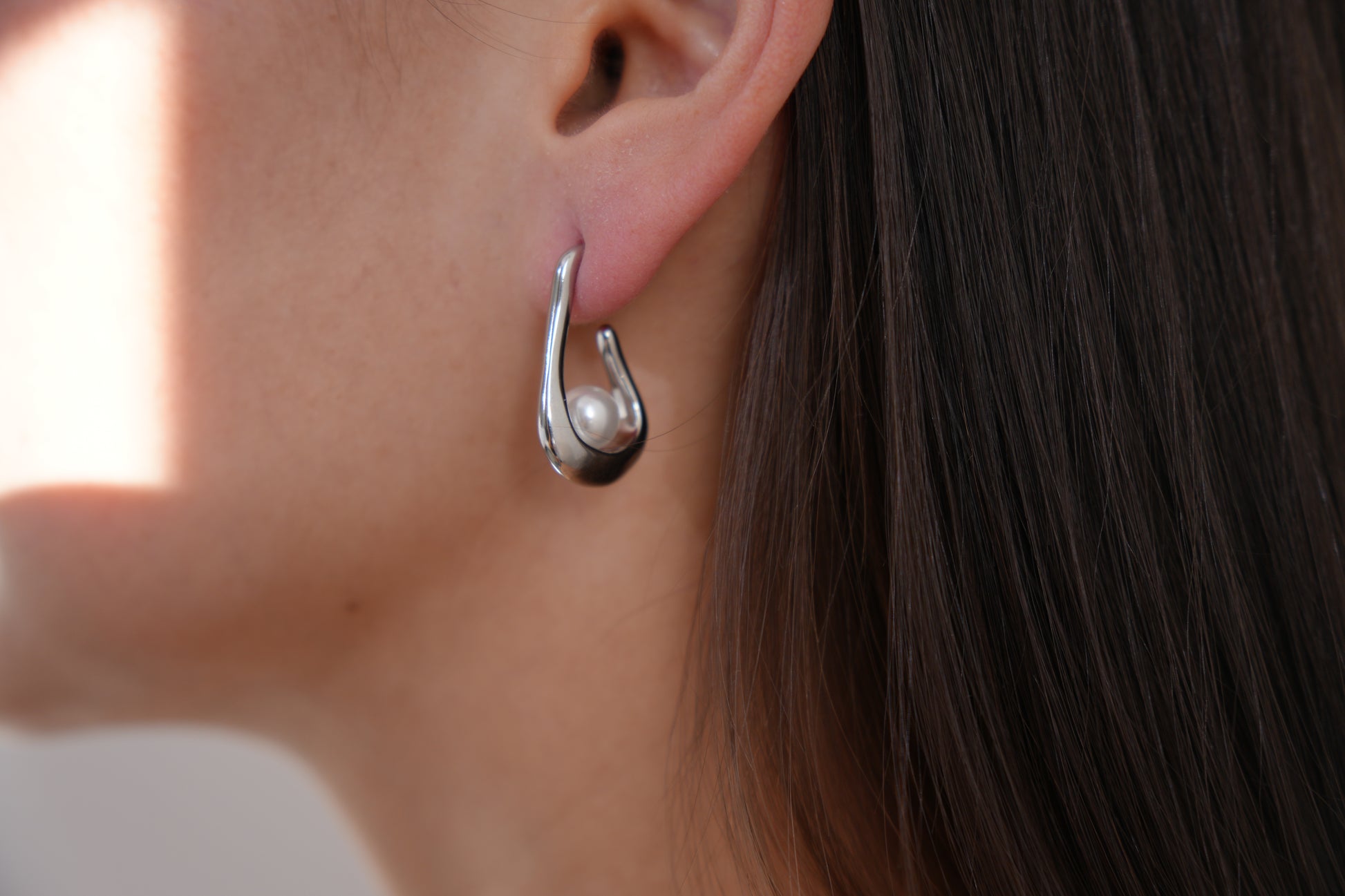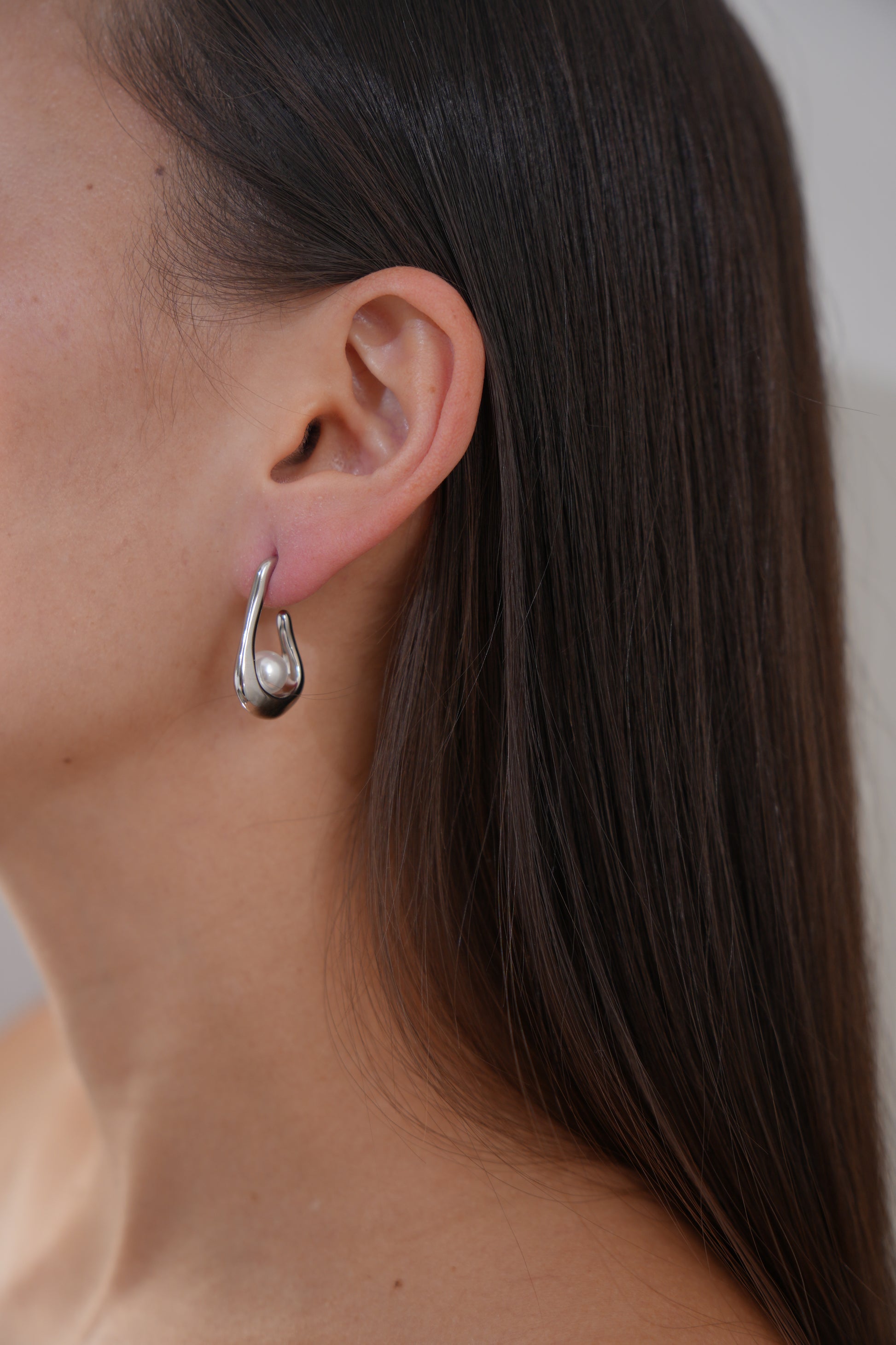 A modern take on the classic pearl earring. These sculptural silver hoops cradle a single floating faux pearl, creating a clean, fluid silhouette that feels minimalist yet artistic. Ideal for everyday polish or evening refinement.